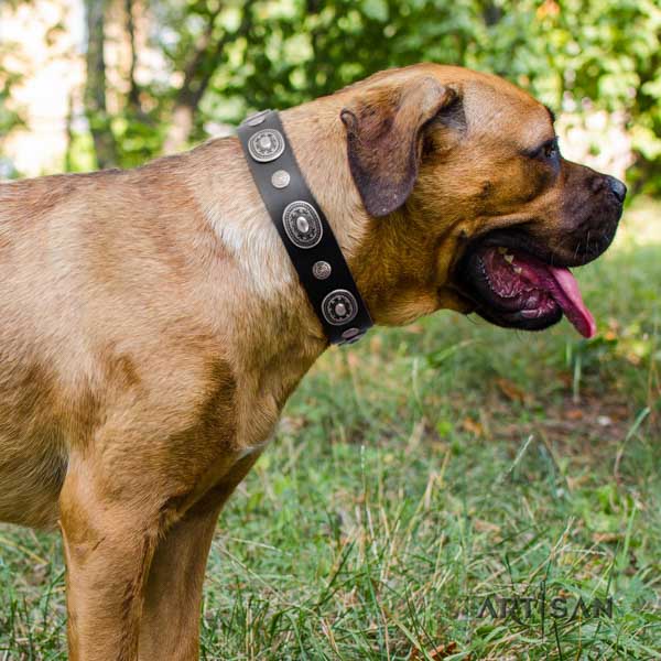 Do you enjoy elegant style? Let your beloved dog enjoy wearing such accessories on! Order this finest quality leather dog collar with decorations from FDT Artisan. This accessory is designed for those who just adore fashion collars. In this remarkable collar, your dog will have more elegant, but impressive look. Your cute Cane Corso will get the best treatment when wearing this accessory. Full grain leather is totally safe.