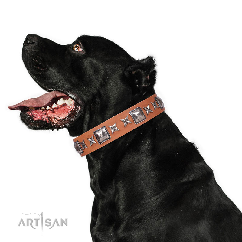 Do you adore elegance and style? Let your adorable Cane Corso take joy in wearing such collars on! Present him this incredible leather dog collar with adornments from FDT Artisan. This accessory is crafted for those who just is fond of fashion collars. In this amazing collar, your Cane Corso will have more elegant, but impressive look. Your lovable Cane Corso will get the best treatment when wearing this accessory. Full grain genuine leather is gentle and totally safe.