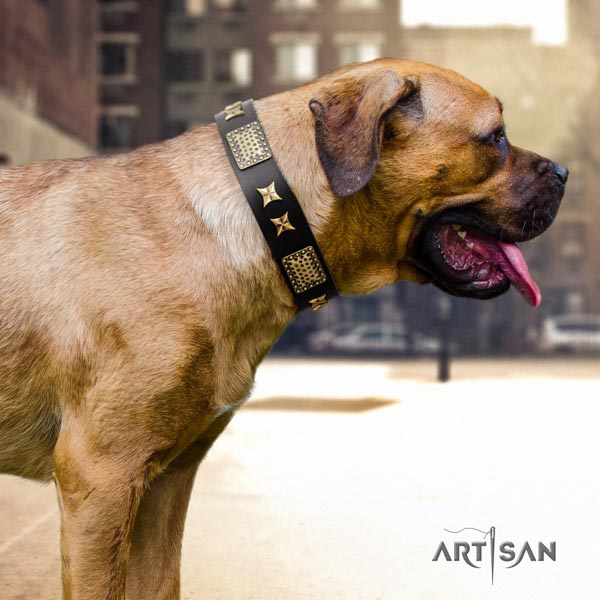 Cane Corso decorated full grain genuine leather collar with rust resistant buckle