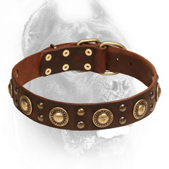 Stylish design. All the circles and half-ball studs are made of brass, the rust resistant material which has attractive gold-like shine. They make this dog item look like a true piece of jewelry.