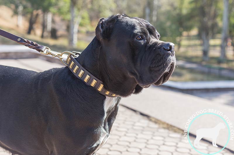 Cane Corso brown leather collar with duly riveted fittings for walking