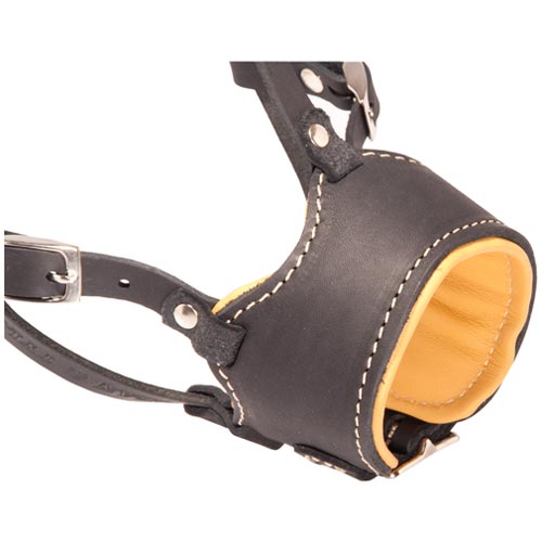 - Practical design. Though the muzzle does not have any decorative elements its look is very fashionable. The muzzle is considered to be universal due to well-made construction and the materials used for its manufacturing. Due to its new ergonomic design the leather agitation muzzle attracts attention. It is distinguished among other dog training items.