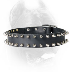 It is an everyday dog accessory available in three colors - black, brown and tan. Whatever color you choose you will not be mistaken - Cane Corso looks fantastically in each of these 3 collars. Dressed in this collar a dog is sure to be the focus of attention. All the glances of passers-by will be attracted to the dog wearing the collar. Make your pet look greater - put this collar on him. 2 rows of spikes beautify this leather buckle collar. in this collar your Corso will seem to be stronger, bigger and more courageous. It is easy to accent the best qualities of the breed with this neck dress.